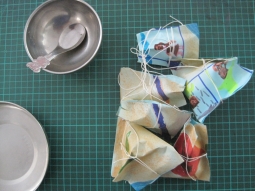逐一對摺後,貼上雙面膠,包上「料』,綁上繩子