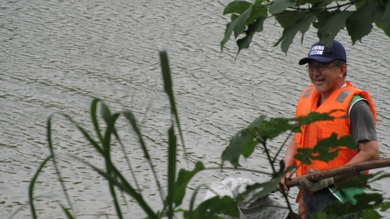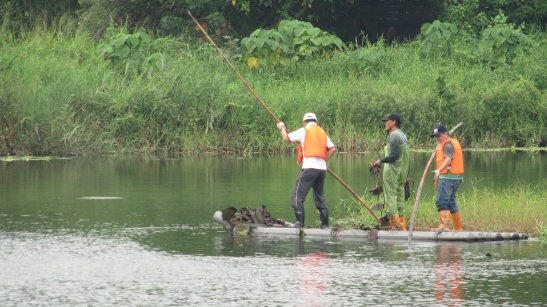 他穿著志工的衣服,他手握長篙腳踏竹筏